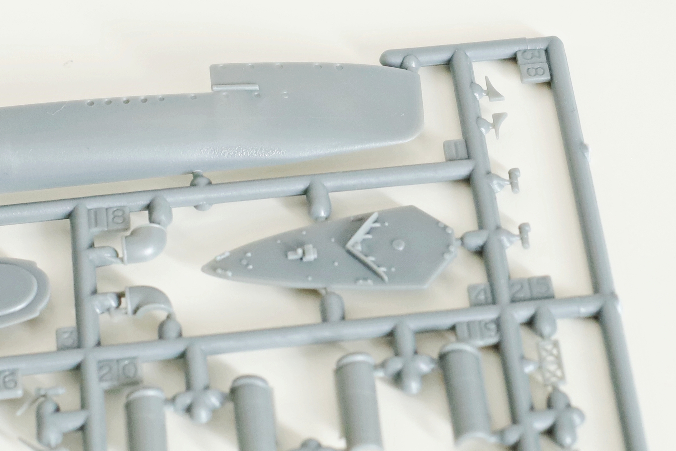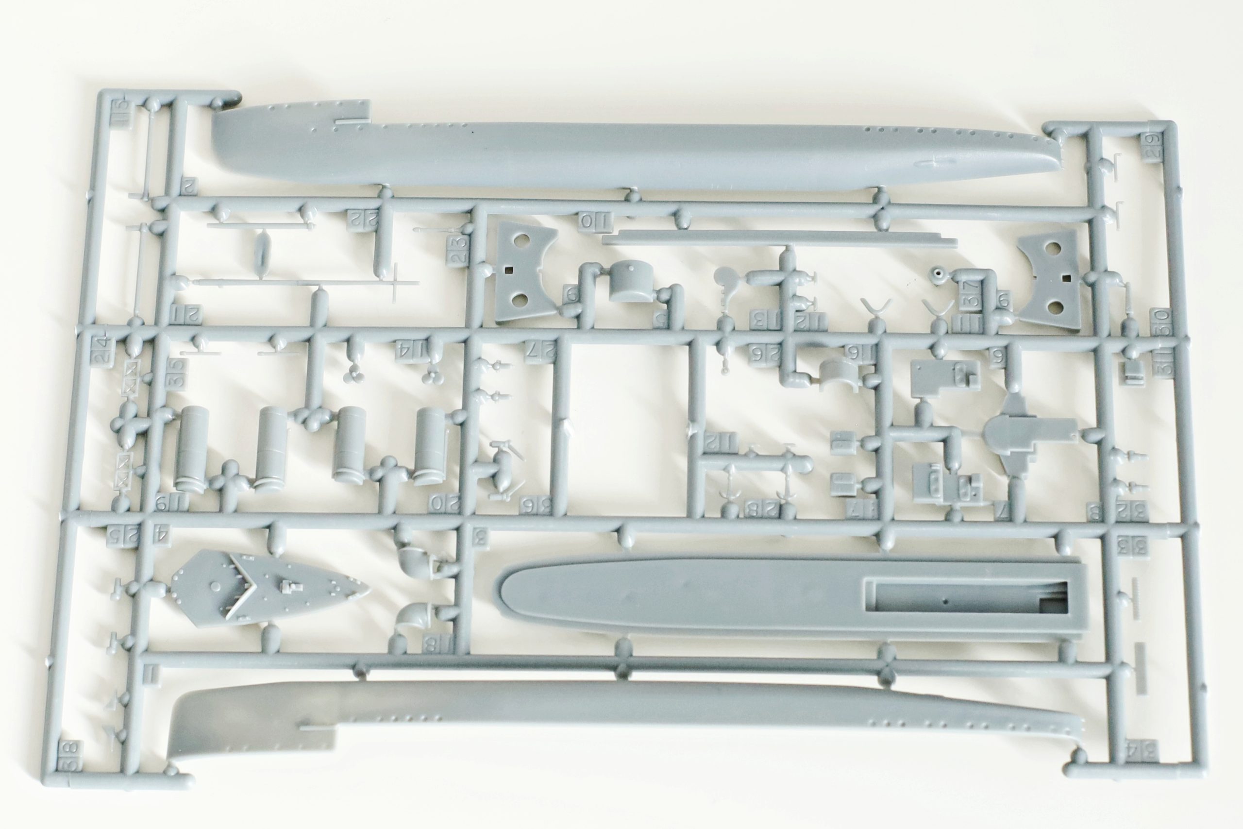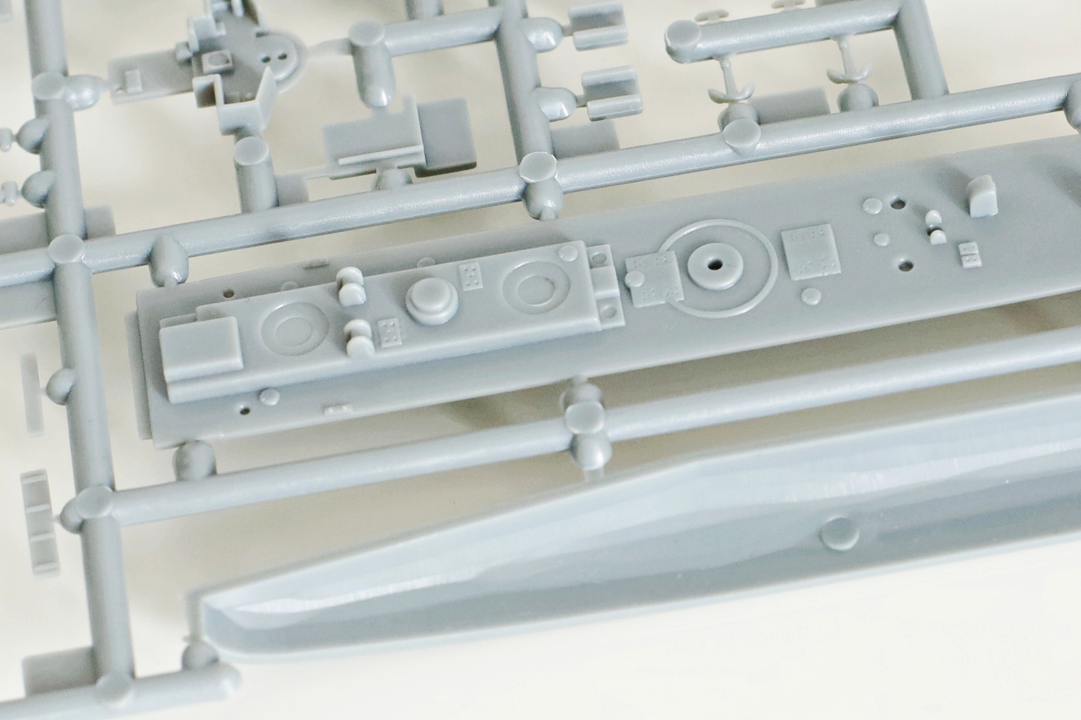 Po bliższych oględzinach modelu widzę, że będzie co robić. Faktura części jest lekko chropowata i miejscami są gorzej odlane. Elementy są rozmyte, brak im wyraźnych detali. Jedna łódź ratunkowa posiada wnętrze. Niekonsekwentnie druga, mniejsza, jest już pełną bryłą. Główny pokład z niewiadomych przyczyn jest podzielony na dwie części. Najprawdopodobniej wykonam więcej elementów własnych, niż tych zestawowych.