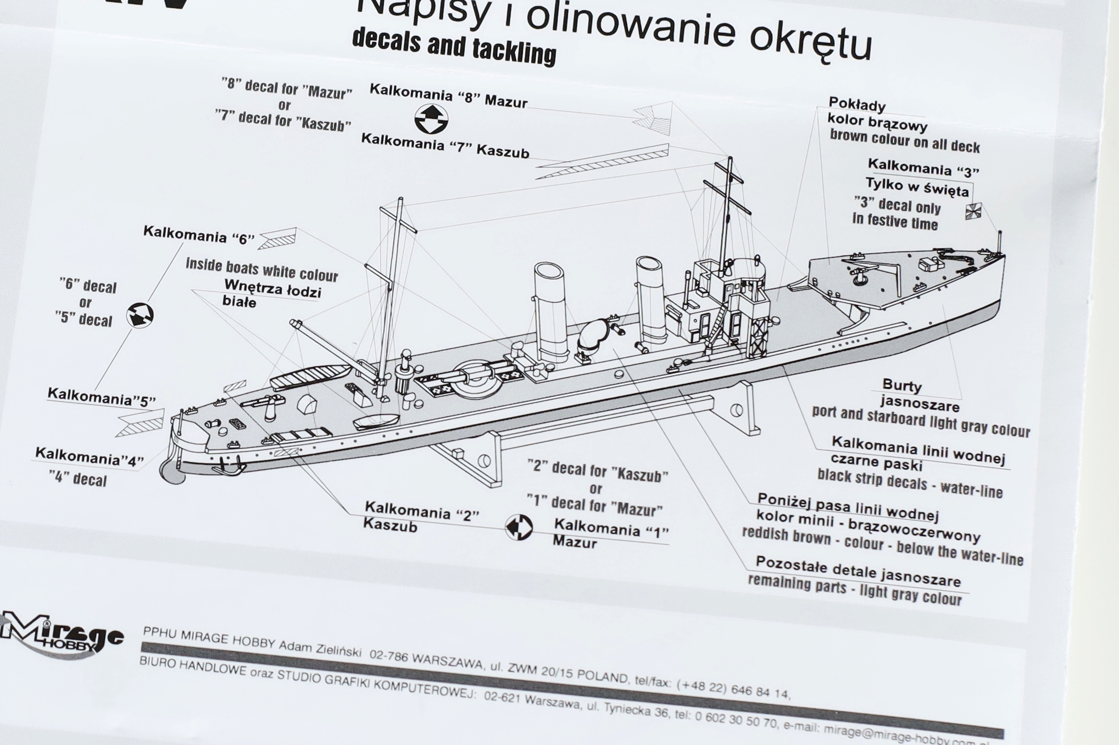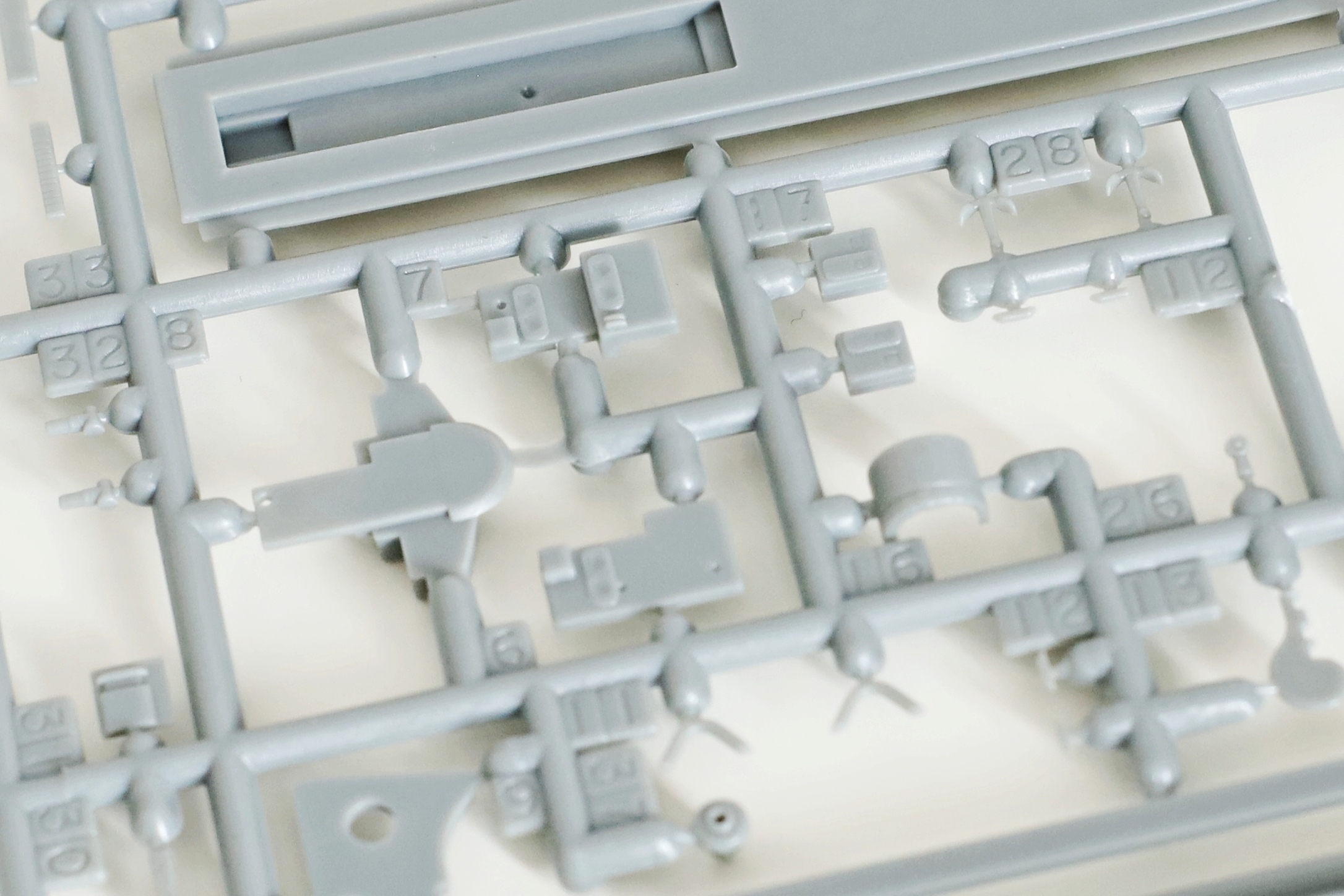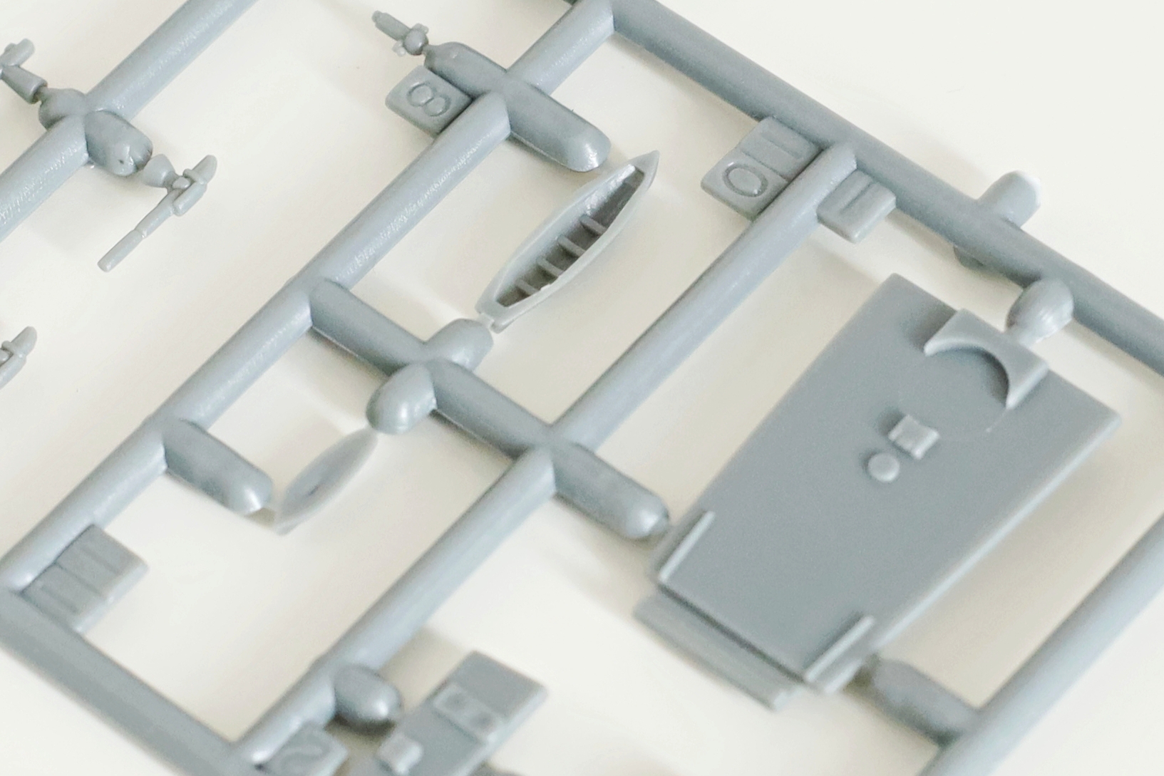 Po bliższych oględzinach modelu widzę, że będzie co robić. Faktura części jest lekko chropowata i miejscami są gorzej odlane. Elementy są rozmyte, brak im wyraźnych detali. Jedna łódź ratunkowa posiada wnętrze. Niekonsekwentnie druga, mniejsza, jest już pełną bryłą. Główny pokład z niewiadomych przyczyn jest podzielony na dwie części. Najprawdopodobniej wykonam więcej elementów własnych, niż tych zestawowych.
